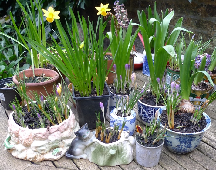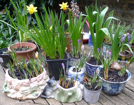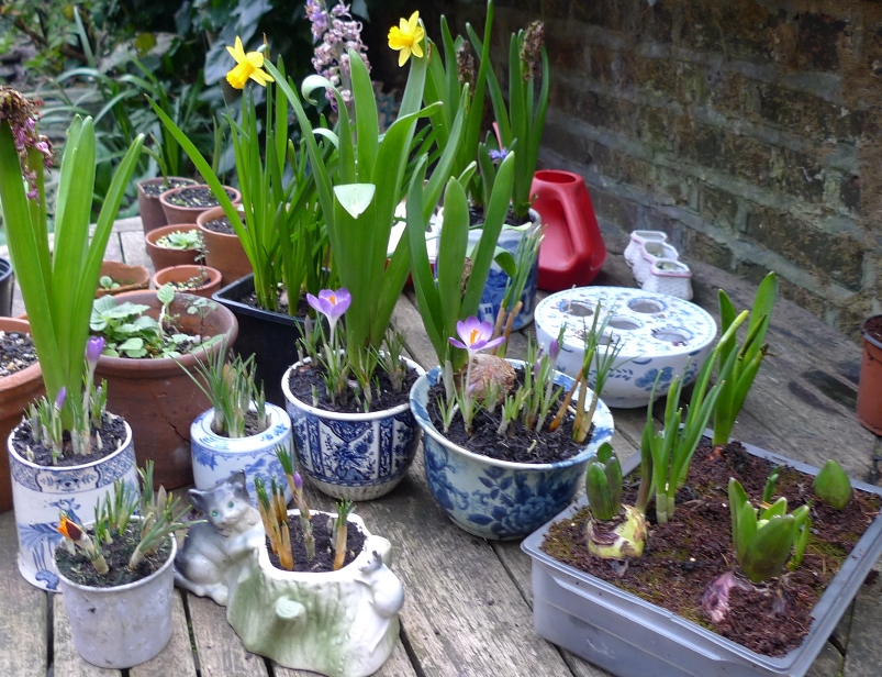 Delft blue and white pots and Yuan design improvised pot with deJager Delft Blue hyacinth bulbs