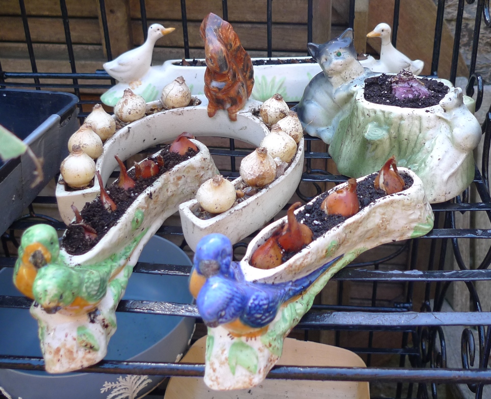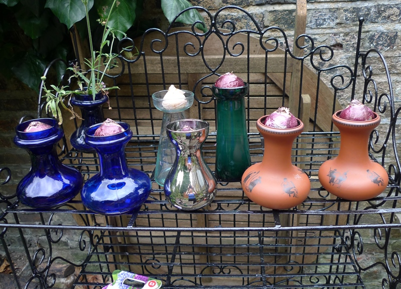 a few more bulbs started, Hornsea bulb pots, a small "unofficial" hyacinth vase