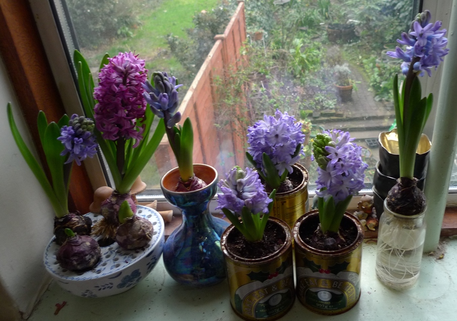 all these have the Sainsburys small hyacinth bulbs, the rose bowl and jam jar have pebbles for the bulbs to sit on