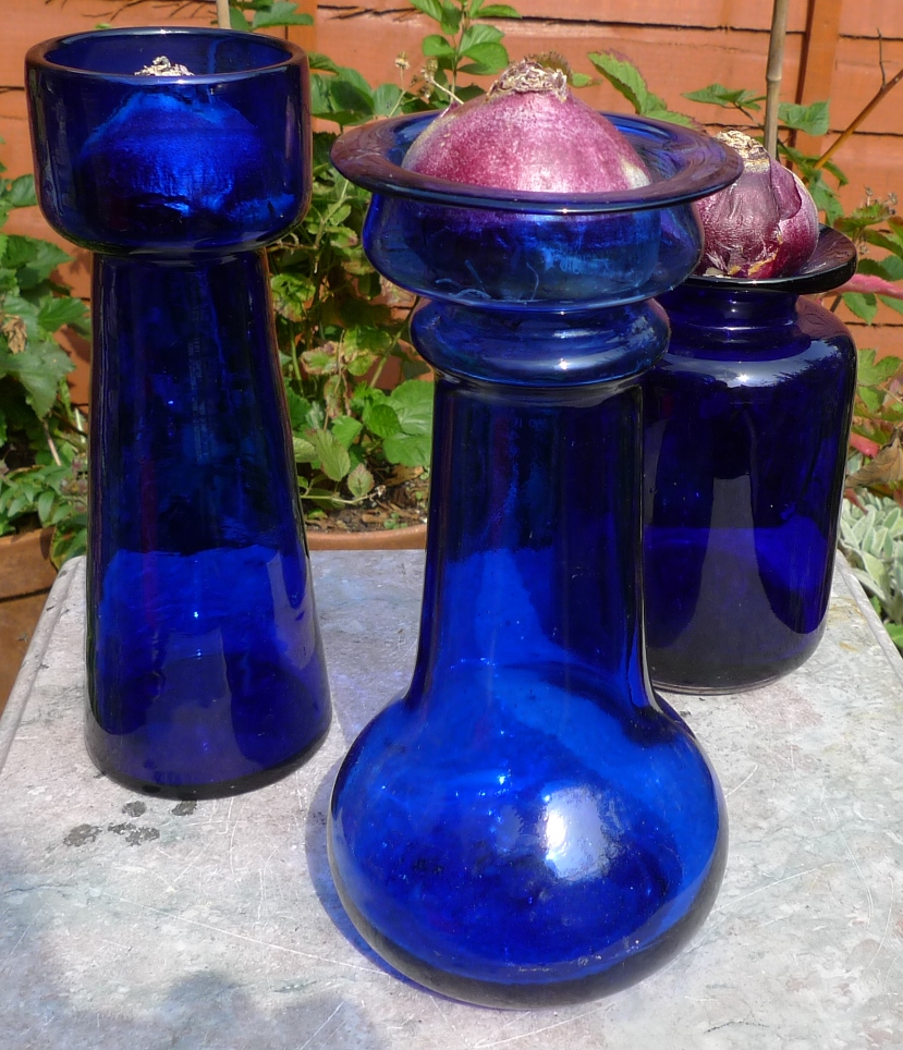 The next step is to get the vases out of the cellar and decide which colour of hyacinth would look best in which vase. Fill the vases with water to just under the bulb. Do not let the bulb sit in water or it will rot.