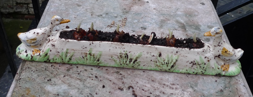 the truffle jars I use for tulip bulbs, the Shorter and Son troughs I use for the smallest bulbs I can find often crocus and/or tulips, once these items are sorted I can think about the amaryllis bulbs, including the white vase at the back
