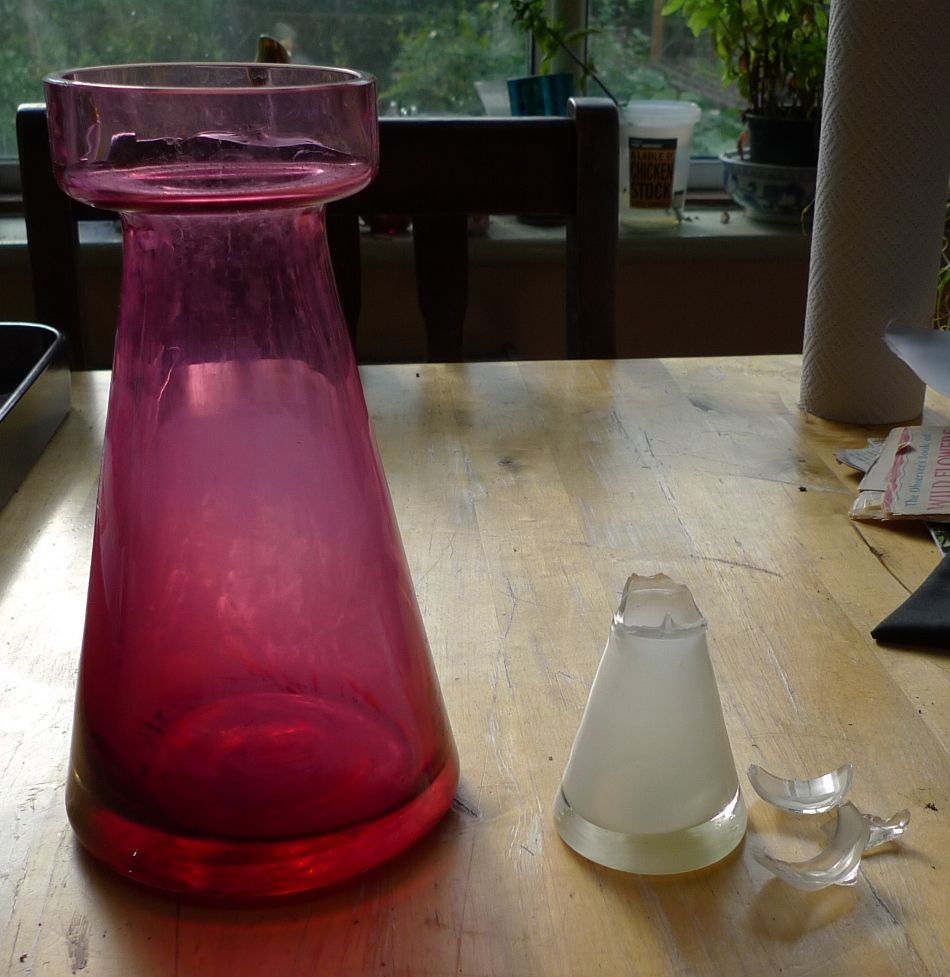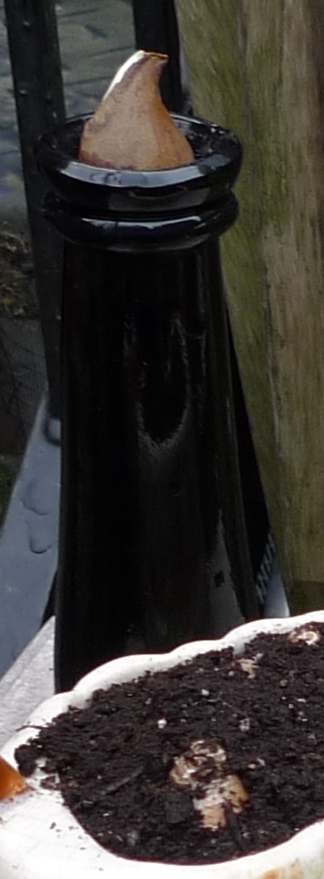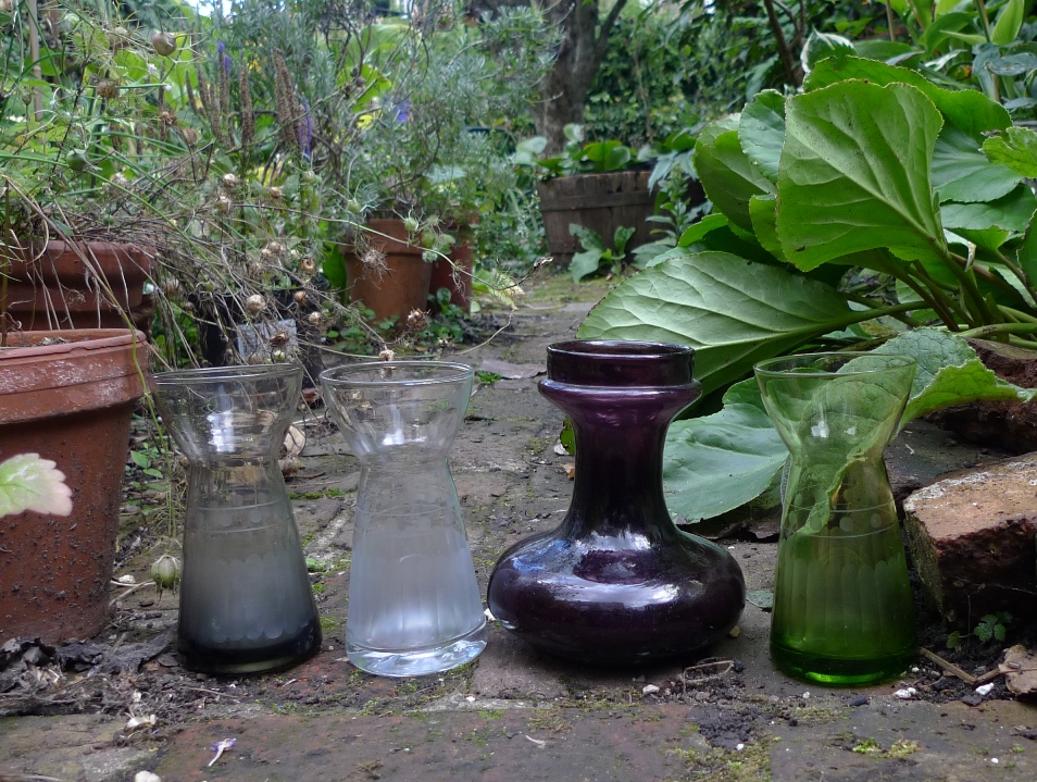 You don't need to use "official" hyacinth vases. The one on the left at the back is Hancock's Britainia ware which holds a hyacinth bulb just fine. The mother of pearl vase on the right at the back is unmarked but looks art nouveau to me. It can hold a hyacinth bulb or a small amaryllis bulb. As I just got a delivery of prepared hyacinth bulbs and I don't have any amaryllis bulbs yet, a hycinth bulb it is. By the way I doubt it was made as a bulb vase. As I bought it at the dump for 50p I don't mind!