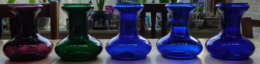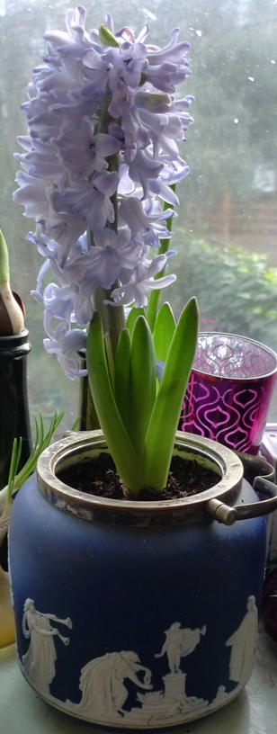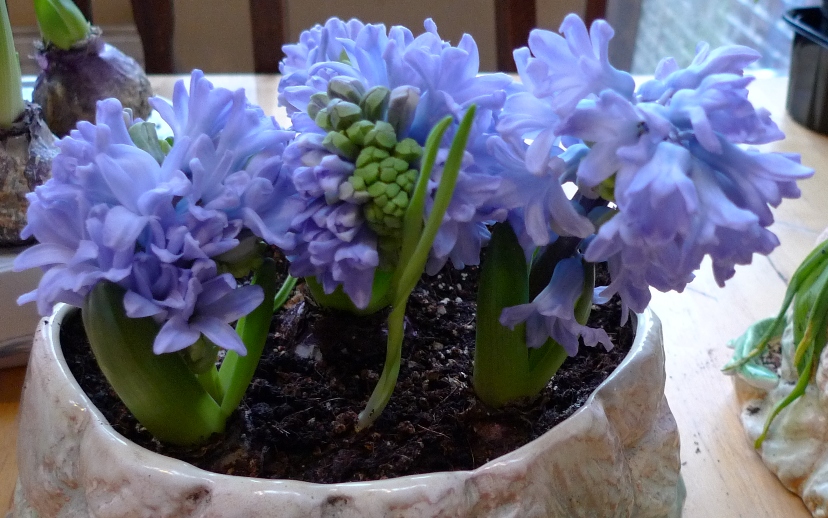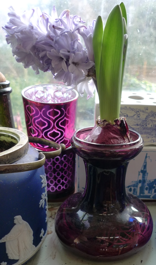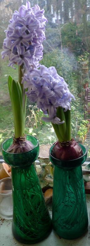 The two tall hyacinths on the right are Sky Jacket. They are generally quite tall with thin flowers, compared to the Delft Blue on the left which is a fat full flower. Notice the secondary stem. That was a bulblet I hadn't noticed until it bloomed. To the left of that is a white Carnegie hyacinth. To the right is a Bristol green vase I bought quite late, too late to grow a hyacinth in this season.