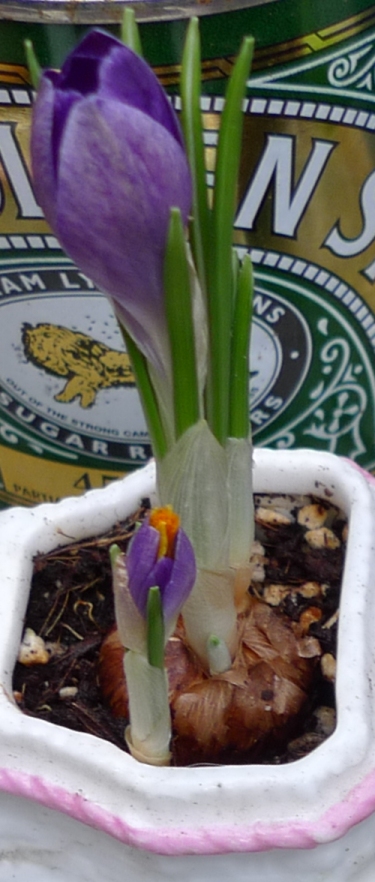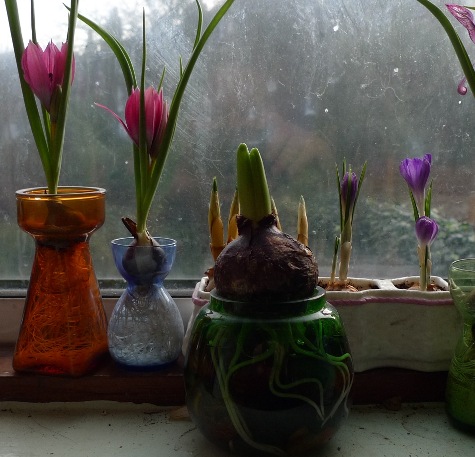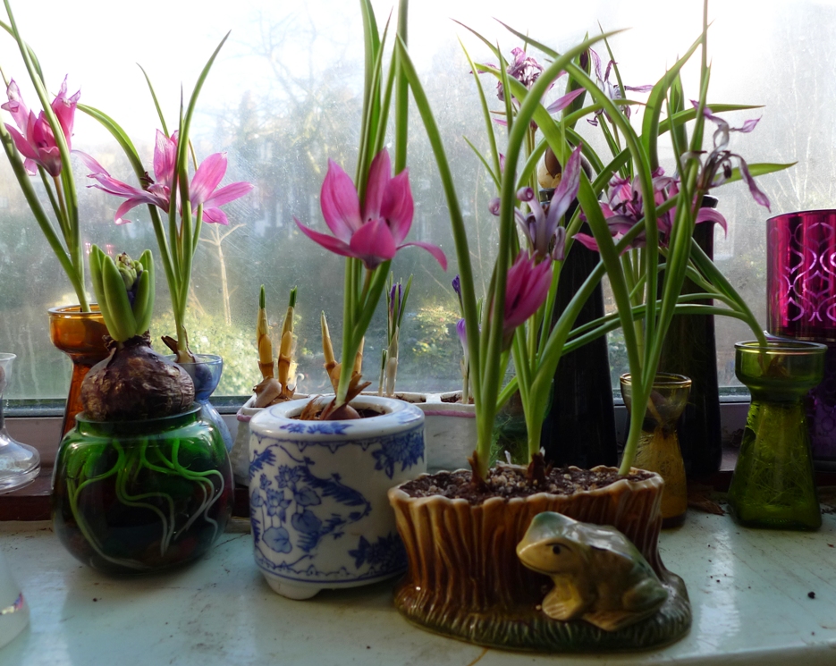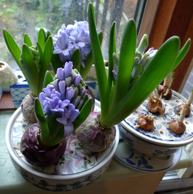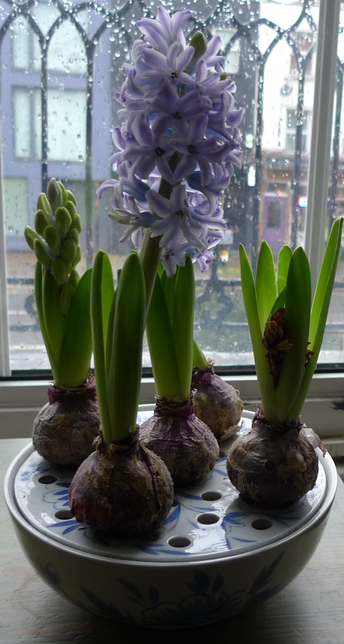 I bought some unprepared hyacinths (Woodstock, Marie and Ibis) and put them in the fridge for 6 weeks to prepare them myself so they were later than everything else. One Woodstock is in bloom (below) and the remaining ones are in the pots pictured below that.