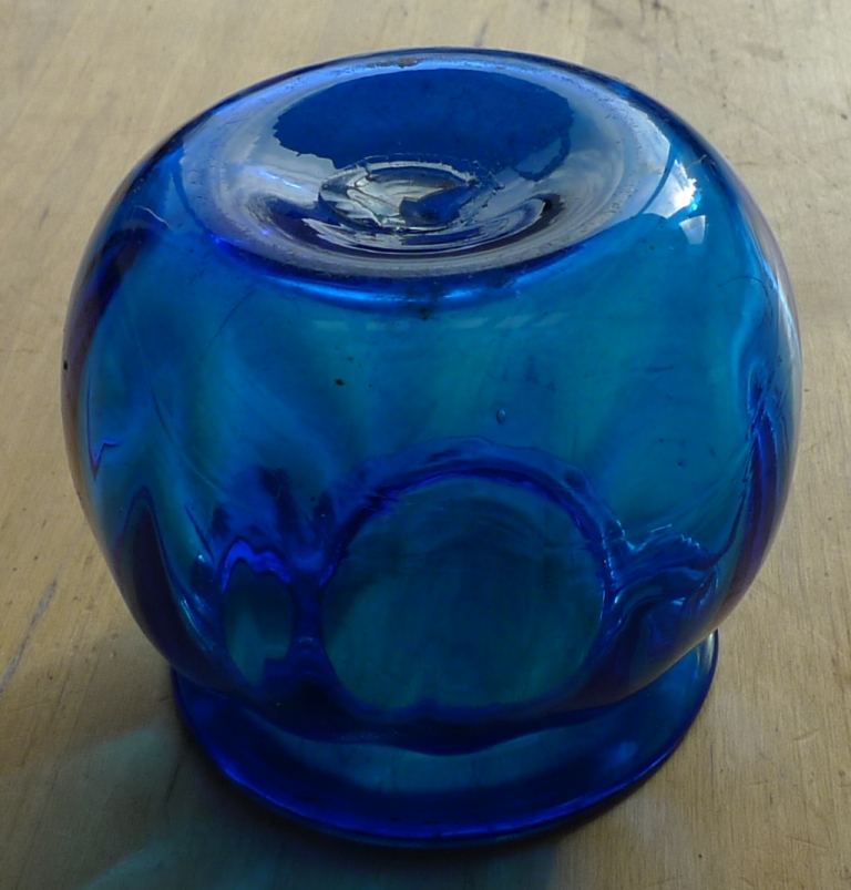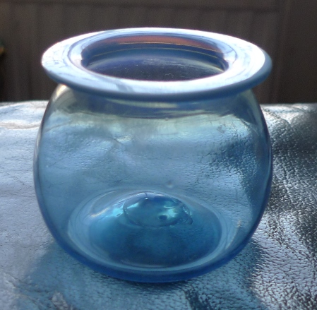 Leeches were extensively used at one time. They had to be kept in something at home and these little glass pots are convenient with a flat rim to allow a covering to be tied on to prevent the leeches escaping. Comparison of the sizes of glass leech pots, from left to right below, large blue probably for a chemist shop, an 18th century clear handblown pot (10 cm tall), last two small for the home (all the small pots on this page are the same size, 5.5 to 6.5 cm, unless otherwise noted). Scratches on the inside of the bowl from use, fishing the leeches out, can be seen on some of the pots.