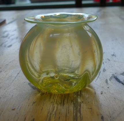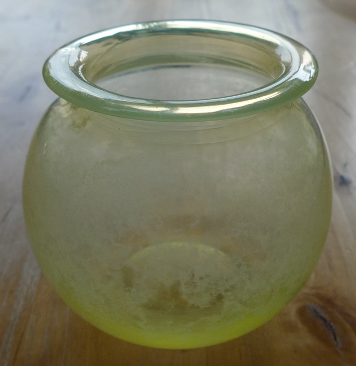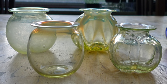 Until I recently bought the pot bottom right which is mould-blown, all the leech pots I owned were free-blown. Uranium pots in normal light: