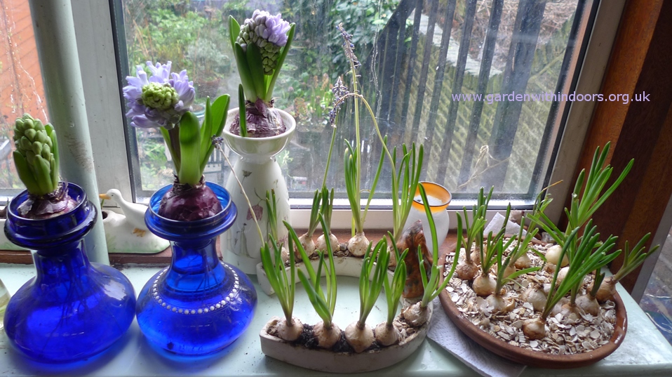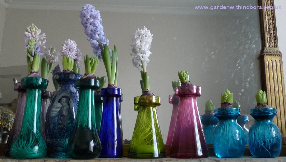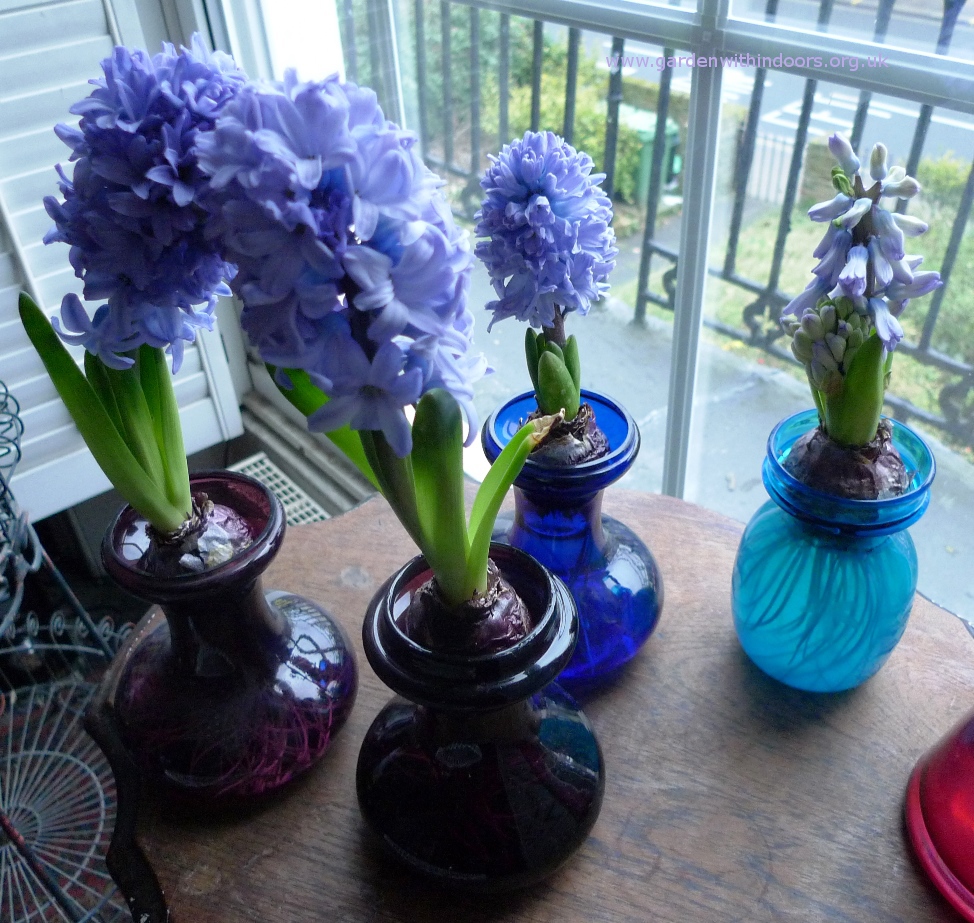 the last bulb bowl with Blue Jacket hyacinths, Pink Pearl in the Hornsea bulb pot, Blue Eyes hyacinth bud in the blue vase, Skyline in the Up the Garden Path Portmeirion vase