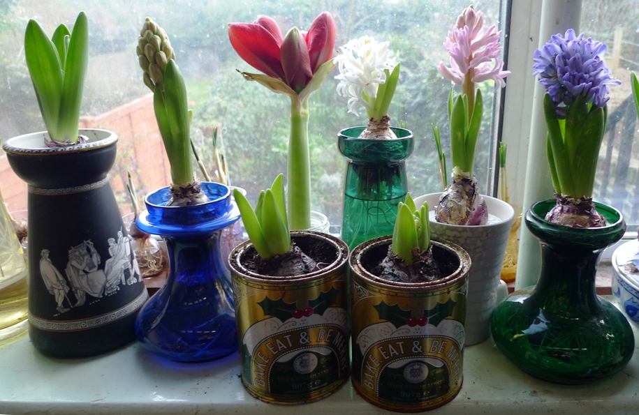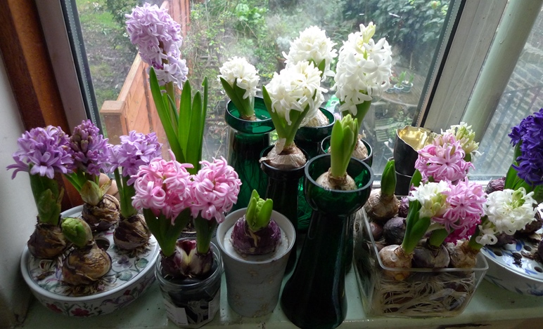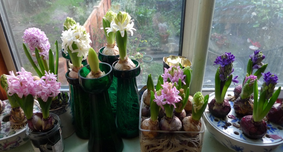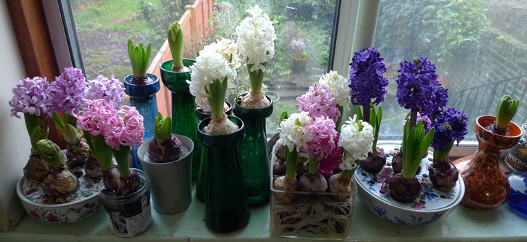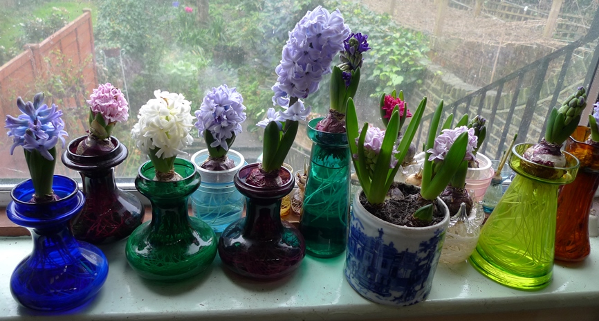 Quick update on the hyacinths downstairs, today (4-1-2016) as everything is changing so quickly, moving along the windowsill from left to right: