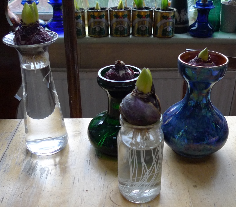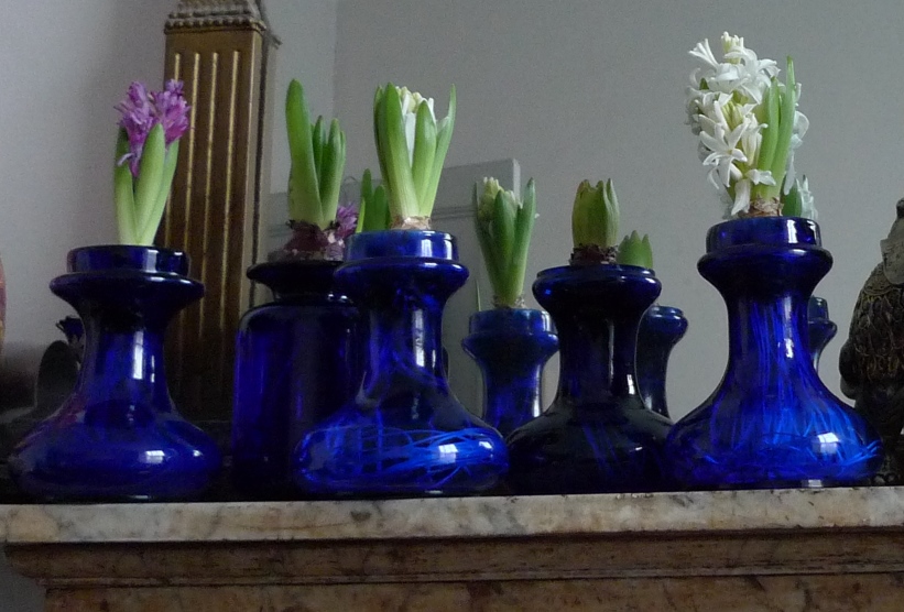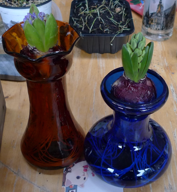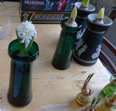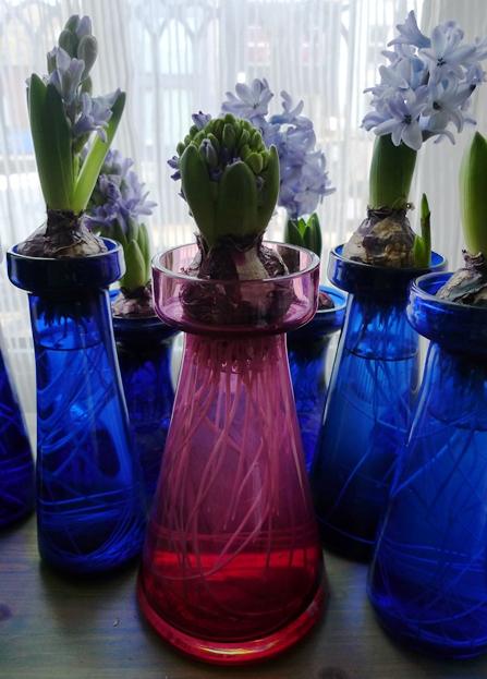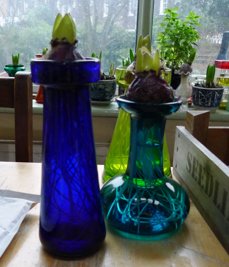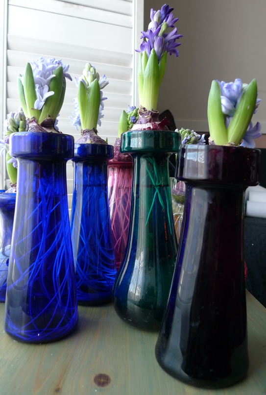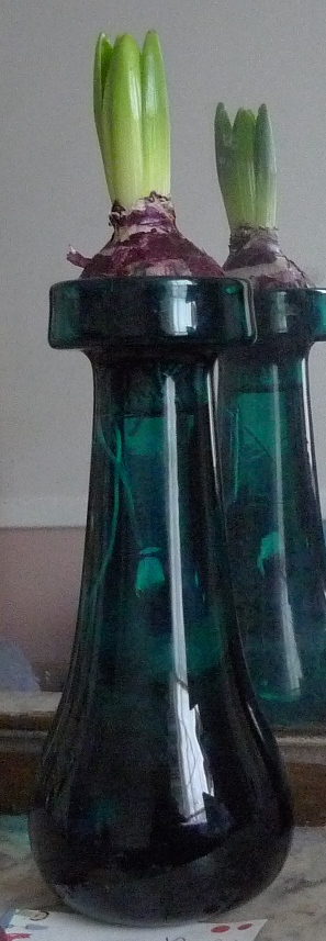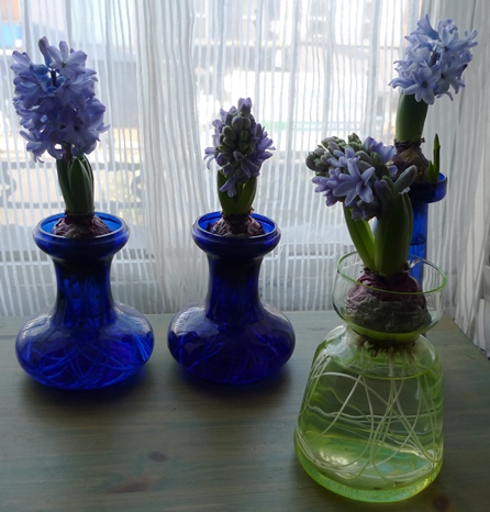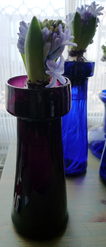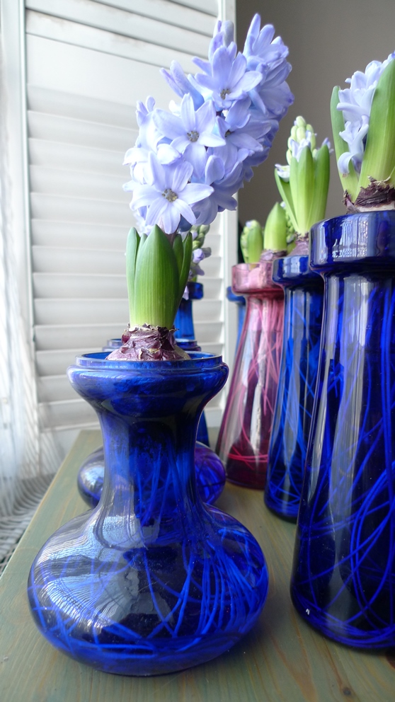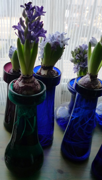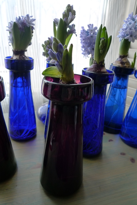(I moved these vases to the radiator under the window just to get as much light as possible to photograph them on a pretty dismal January day but hyacinths should not be anywhere near a radiator!)