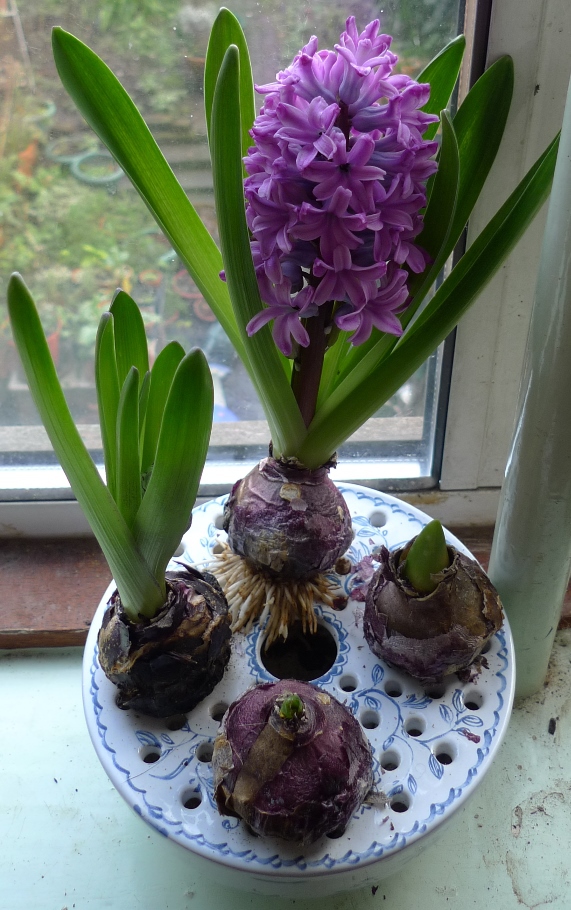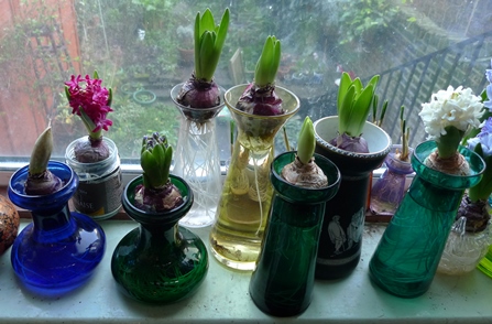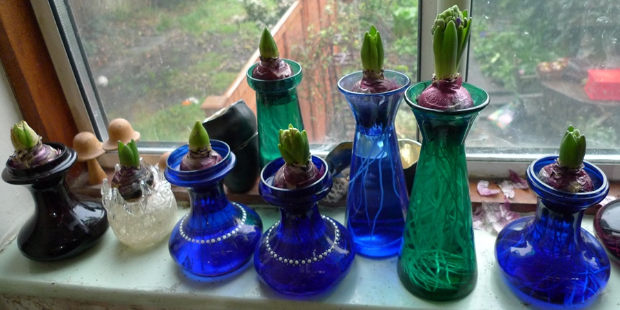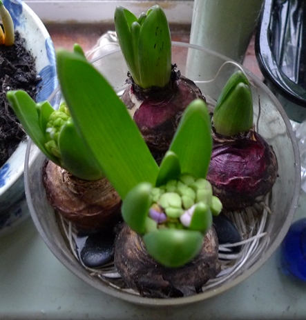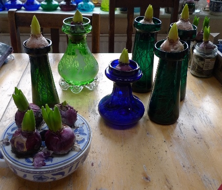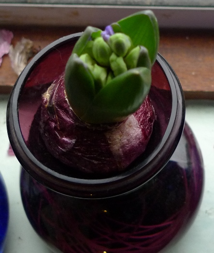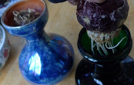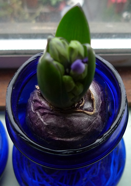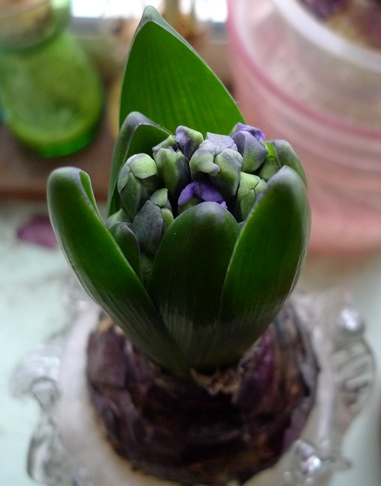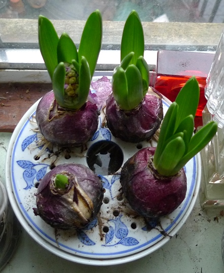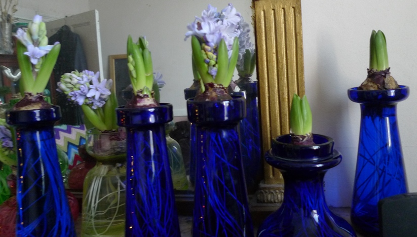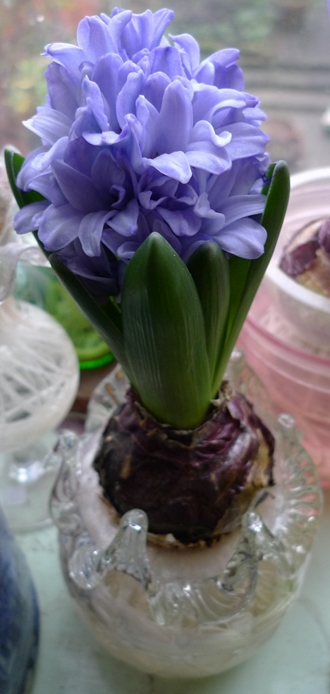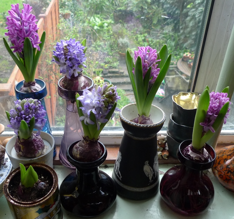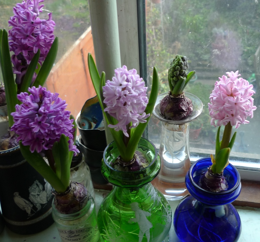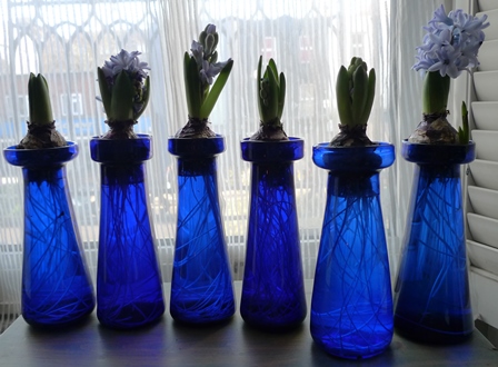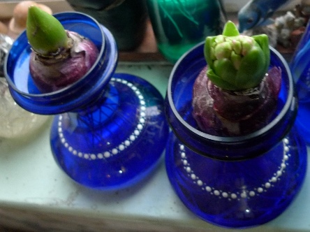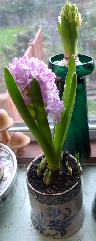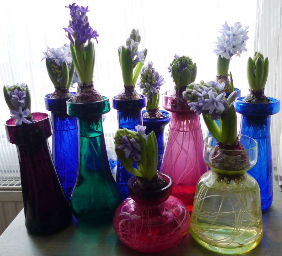 (I moved these vases to the radiator under the window just to get as much light as possible to photograph them on a pretty dismal January day but hyacinths should not be anywhere near a radiator!)