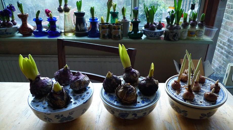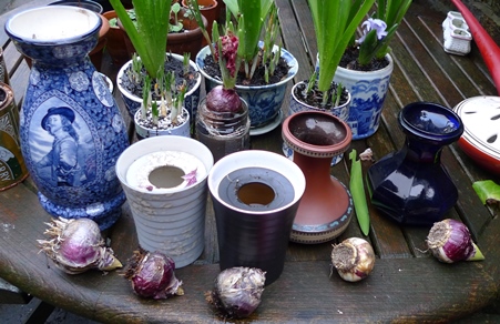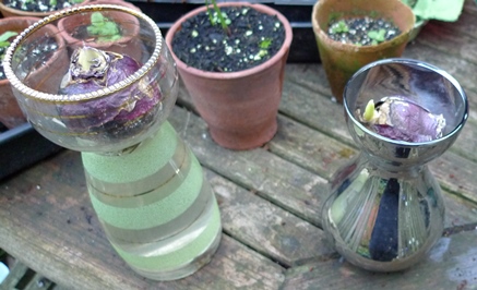 the bulbs in these vases (above and below) are not looking well at all but will await flowering