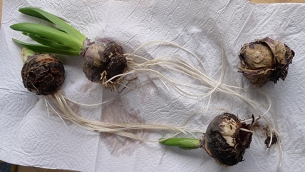 I bought these prepared White Pearl bulbs for some late vase purchases but bought too many so just had to put them in any pots to hand. They all seemed to have bulblets which I will try to grow on.
