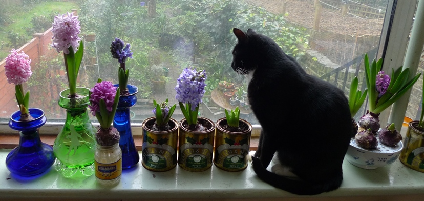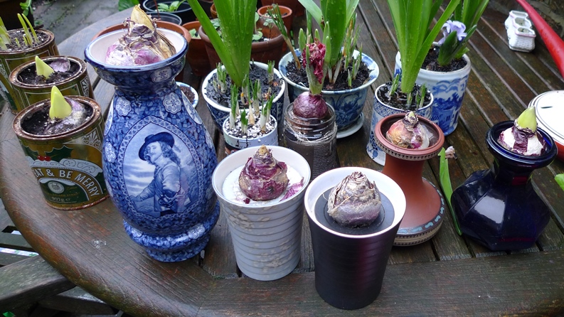 any bulbs I have in pots with bulb fibre/compost have those small annoying black flying insects (fungus gnats) so I have banished these outside, the 2 pots on the left have a rotted hyacinth bud each so not much point in keeping them indoors, the pot on the right had 2 of the hyacinths in bloom almost spent