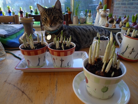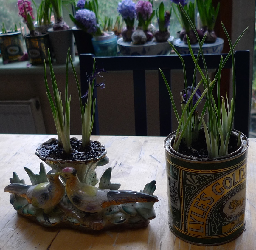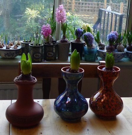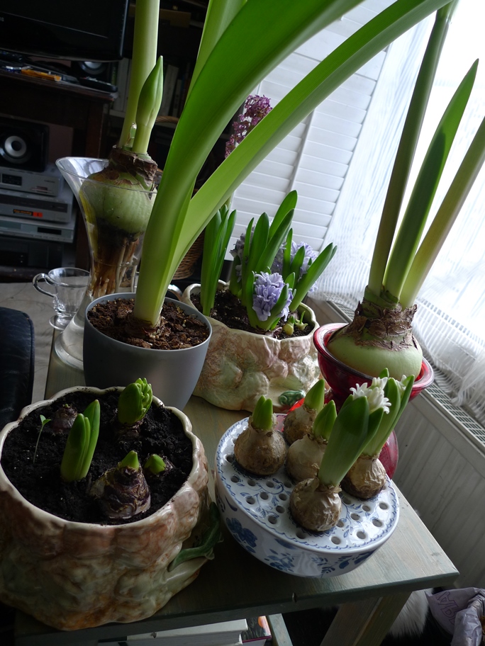 the bulb bowl below has Carnegie hyacinths, one of which is just starting to bloom, also on that table, two SylvaC pots with hyacinths and 3 amaryllis