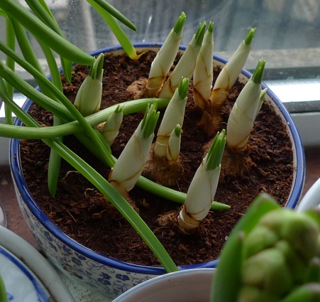 All the Delft Blue that were upstairs are spent, making way for these Gypsy Princess and a Pink Pearl hyacinth. I have never had so many hyacinths in bloom for Christmas and so many over by Christmas. The autumn's warm weather has them thoroughly confused.