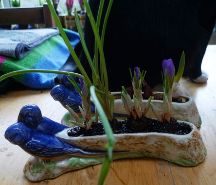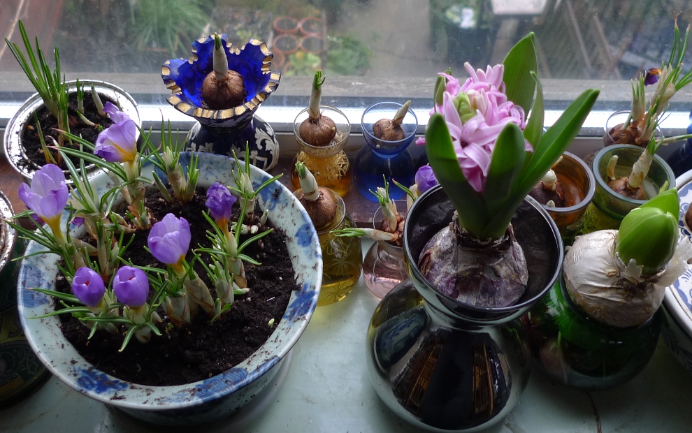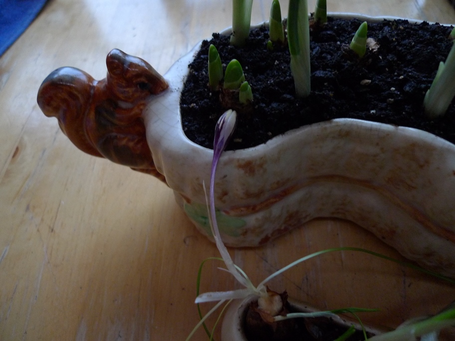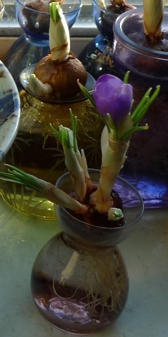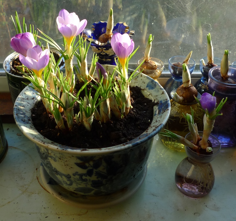 crocus blooms and buds, in the background tulips in the truffle bottles/jars