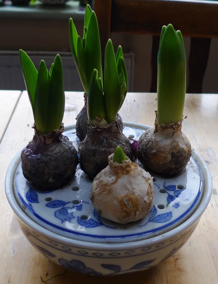 I thought an update on the other bulb bowls would be good. This bowl, below, has Royal Navy hyacinths, all buds so far.
