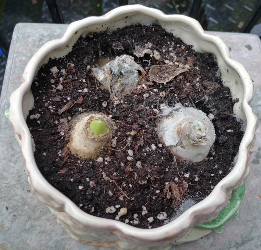 I put this bulb bowl (a good candidate as most of the bulbs were already spent) outside to make room for Christmas lunch but it has since gotten so cold that when I brought it in today I see the water in the bulb bowl is frozen. I haven't had a forced hyacinth over water that is frozen so I don't know what the result will be but I will let it melt and see what happens.