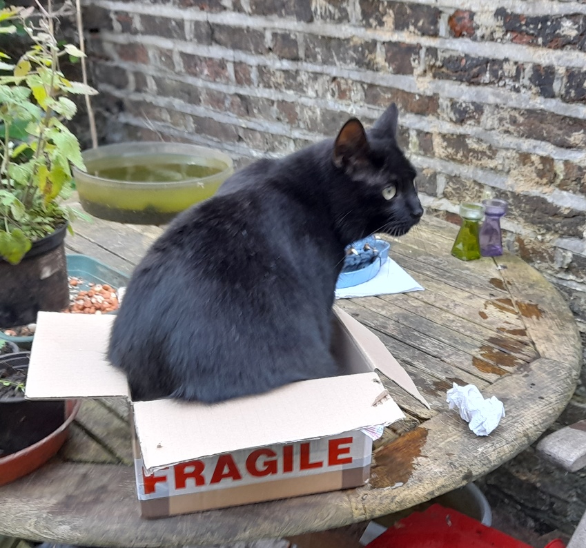 when I got a box to put the hedgehog and vases in to put them into the cellar, Rocky, being a typical cat, had to investigate the box