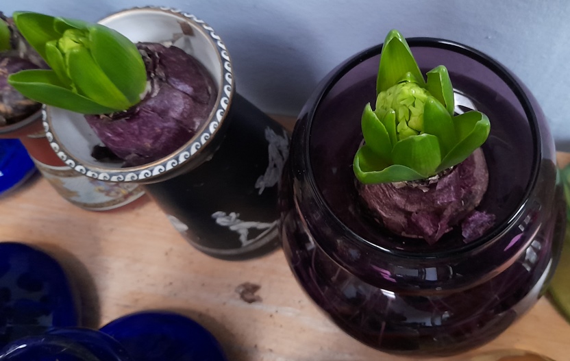 Wedgwood hedgehog with crocus bulbs. I just brought it out of the cellar today so the crocus shoots are looking very anemic but they will green up in a few days. As I recall every bulb flowers, unlike the crocus in vases below.