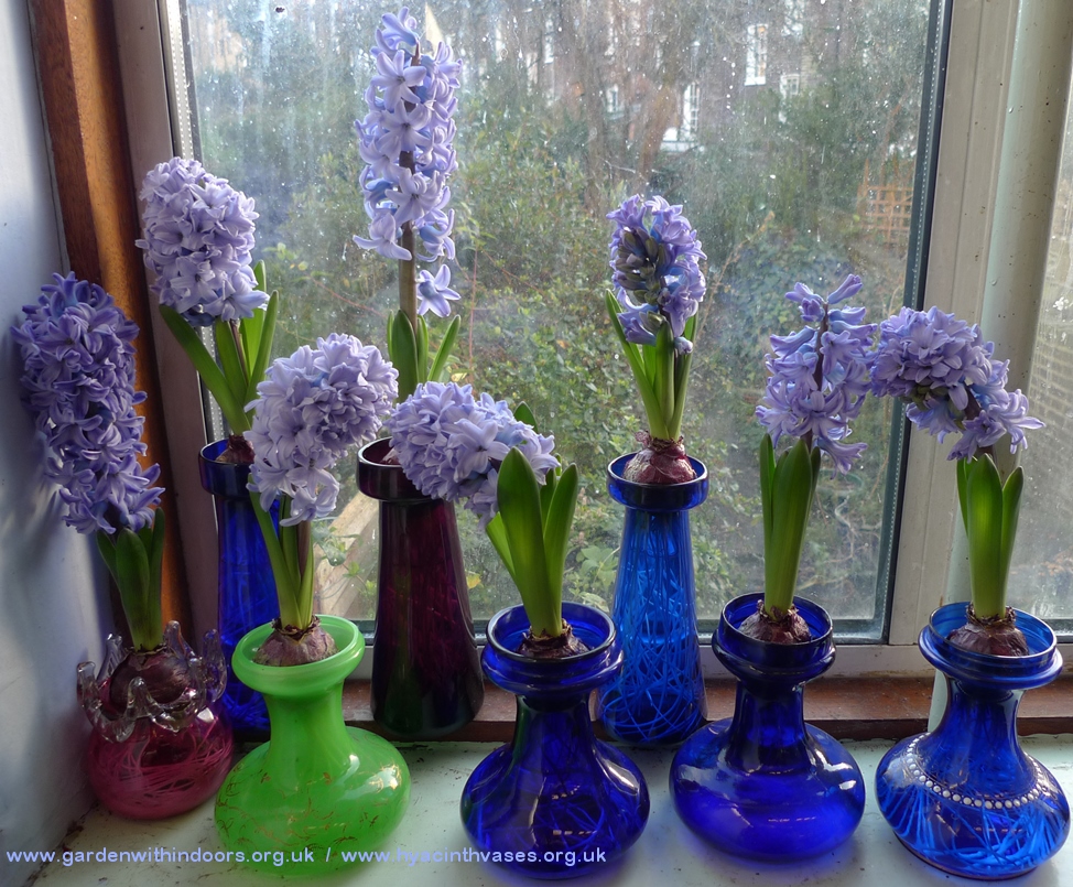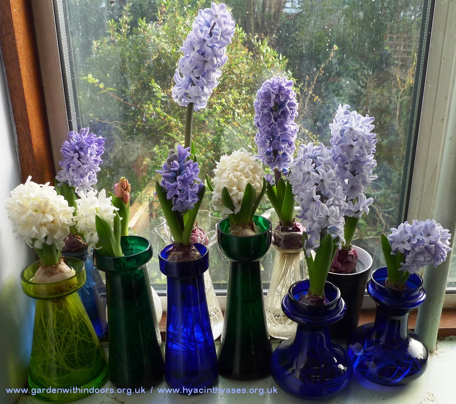 White Pearl hyacinths on the left, Blue Sapphire in the middle, Delft Blue on the right