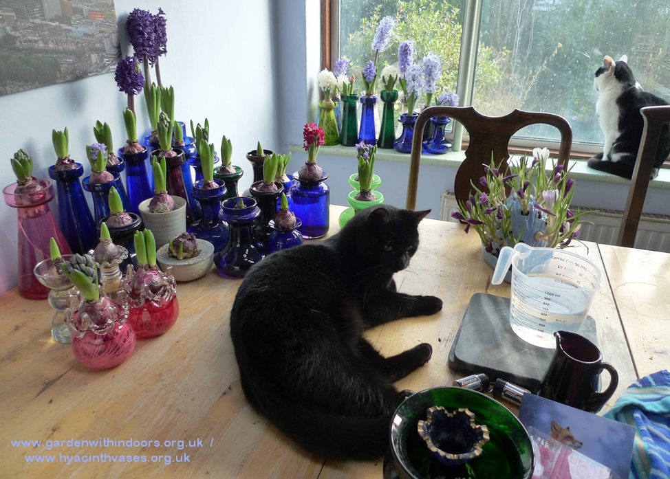 photo-bombed by 3 black cats - and a black hyacinth vase, my latest purchase from ebay, this is the first time I've bought this type of vase 10-1-2022