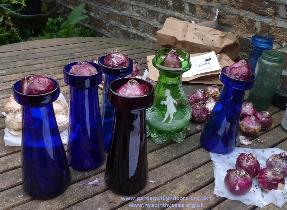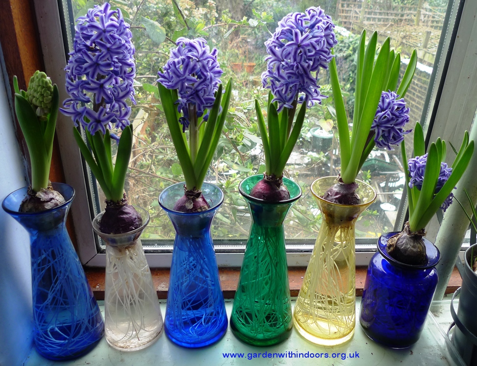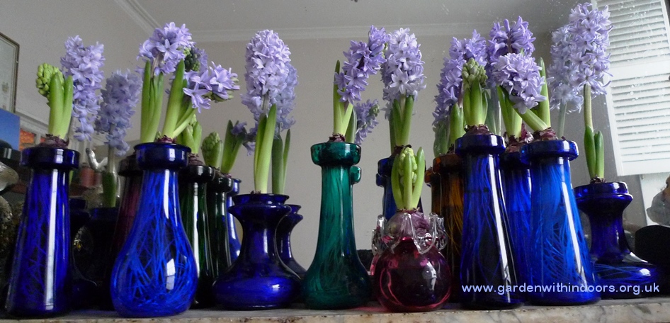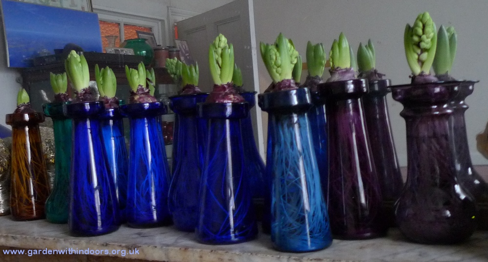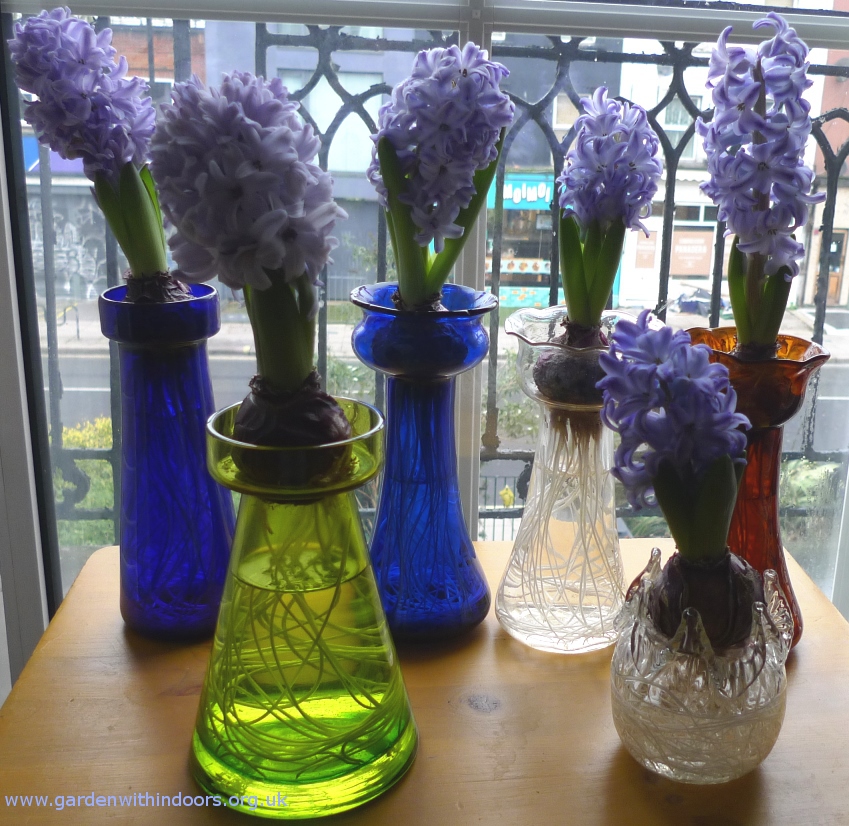 The final hyacinths of the forcing season. I'm not sure if those two on the right are going to make it but then I wasn't sure the two in the amethyst and green vases on the left would a week or so ago but they've grown well.