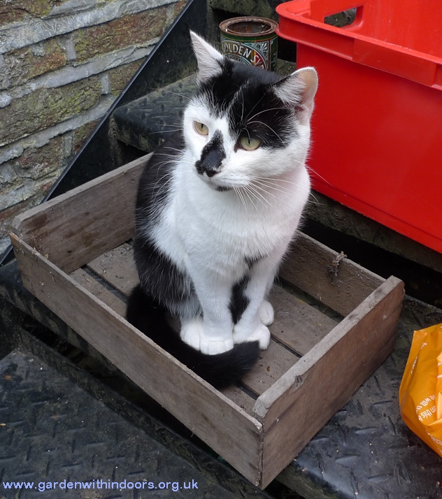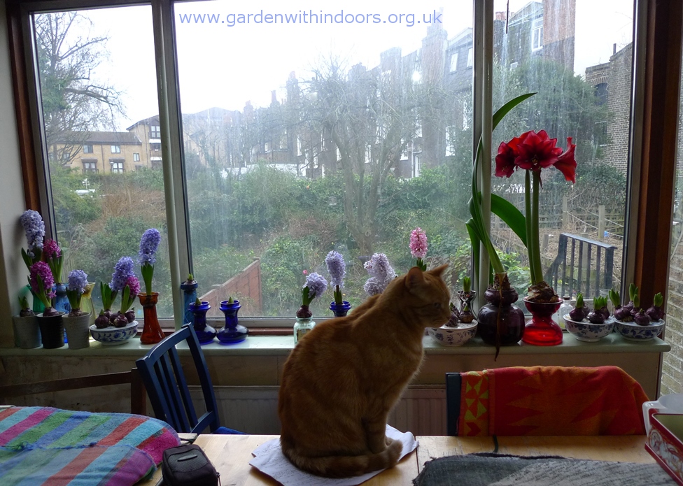Socks doesn't come outside very much but eventually even he had to come and investigate the hyacinth bulb forcing