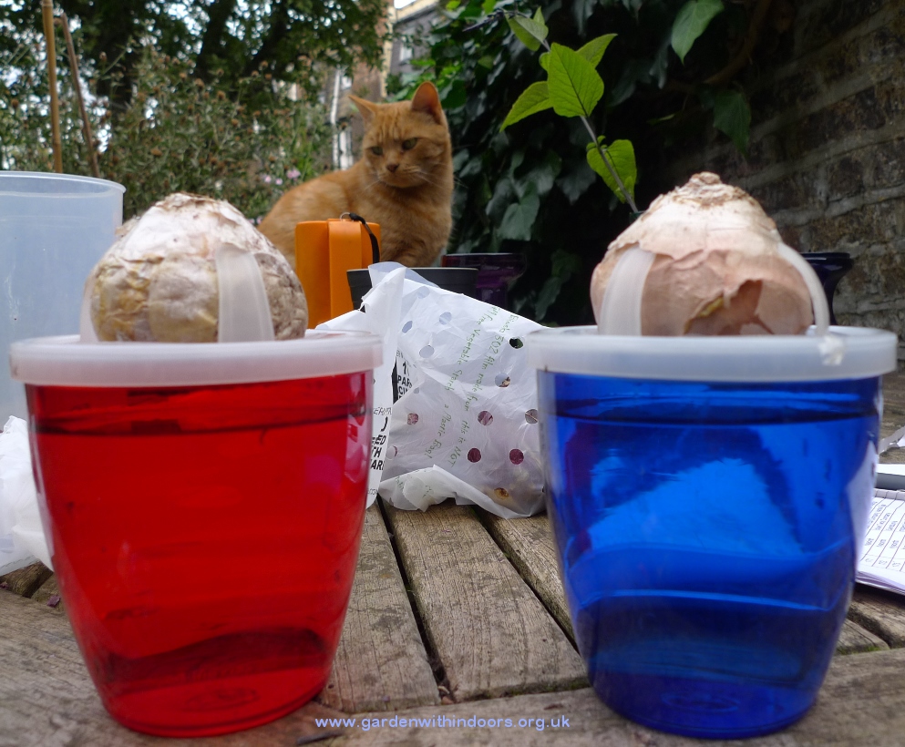 The first step of hyacinth bulb forcing is getting some hyacinth bulbs. This week I received my order from Peter Nyssen and bought some bulbs from B+Q and Sainsburys. I have a print-out of my spreadsheet where I can note which bulb I put in each vase (each vase is numbered). As soon as I started, the cats started appearing, first Bear.